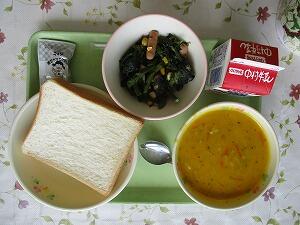 食パン 牛乳 カボチャのスープ ほうれん草のソテー 黒豆きなこクリーム 678Kcal