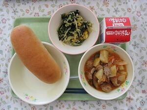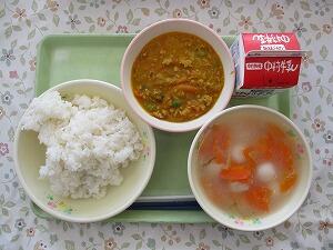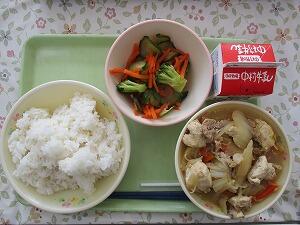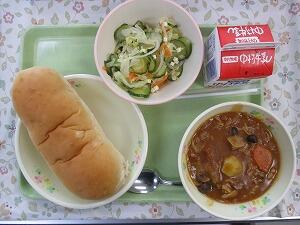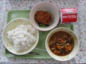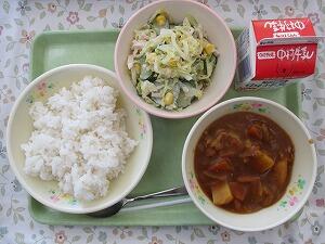 給食では主に月に1回カレーが出ます。カレーは使用する材料によって様々なカレーが楽しめますが、今日は県内産の豚肉、人参、じゃがいもを使用したポークカレーでした。