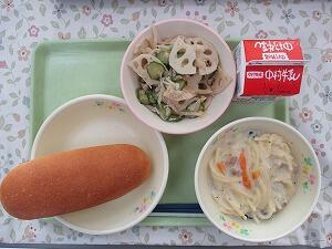減量ミルクパン 牛乳 クリームスパゲッティ 鶏とれんこんのサラダ 549Kcal