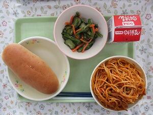 減量黒糖パン 牛乳 ミートスパゲティ アスパラガスのサラダ 592Kcal
