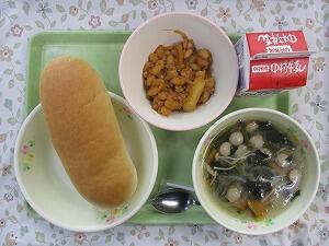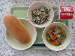 コッペパン 牛乳 ミートボールと野菜のスープ煮 アスパラの胡麻マヨネーズ和え 569Kcal