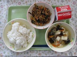ごはん 牛乳 豚肉と厚揚げの味噌煮 小松菜のおかか和え 560Kcal