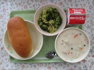 チーズパン 牛乳 白花豆のポタージュ グリーンサラダ 587Kcal