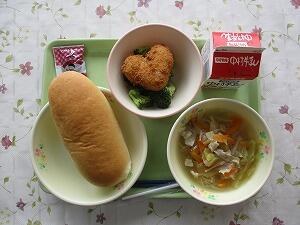 コッペパン 牛乳 千切り野菜のスープ ハートのコロッケ 茹でブロッコリー デキシーマーシャルビーンズ (チョコ大豆) 626Kcal