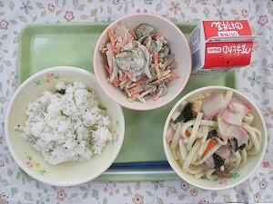 減量大根葉ごはん 牛乳 わかめうどん ごぼうサラダ 603Kcal