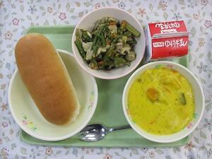ポタージュとは、フランス料理のスープのことを言いますが、澄んだスープのコンソメに対して、ポタージュは濁りのあるスープをさすことが多いです。今日の給食のポタージュには、白花豆をつぶしたペーストを入れて作ってあるので、豆は見えませんが、白花豆の栄養や食物繊維はしっかりとれるそうです。