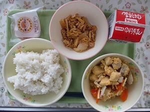 今日の給食は都農中学校のリクエスト献立です。8日のキムタクごはんの具と焼きプリンタルトも都農中学校からのリクエスト献立でした。