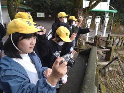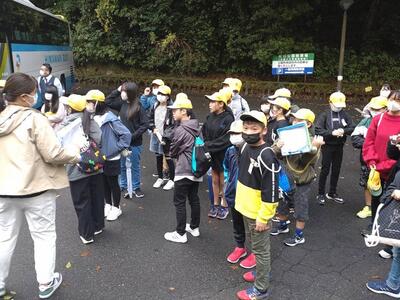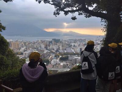 修学旅行2日目の最初の見学地、城山展望台に到着した子ども達です。展望台は、錦江湾や鹿児島市街地が一望できる場所です。空には雲が広がっていましたが、桜島もなんとか見ることができ大満足だったようです。