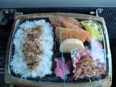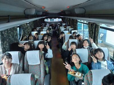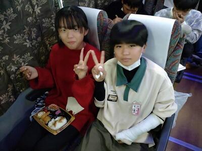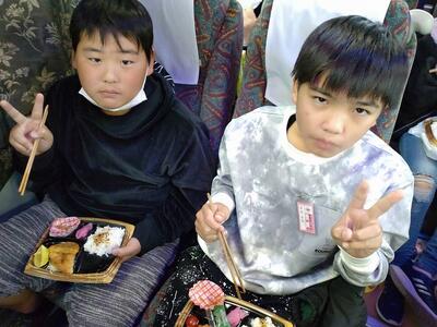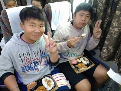 班別自主研修を終え、昼食の時間。今回は、バスの中でのお弁当。とてもおいしそうです。ボリュームがありますね。窓の外には、桜島が見えます。お天気も回復しているようです。子ども達は、この後の最終見学地の「いおワールドかごしま水族館」の見学をとても楽しみにしています。