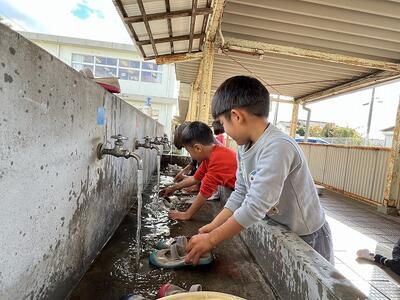 12月1日(金)の5時間目に、1年生が生活科でシューズ洗いに挑戦しました。「自分のことは自分で出来るようになること」を学ぶ時間です。1週間使った自分のシューズを洗剤とたわしで懸命にきれいにしていました。力を入れて、ごしごし洗っていました。次第にきれいになるシューズを見て、とても嬉しそうな表情の1年生の子ども達。土日の間に乾かし、月曜日の朝にピカピカになったシューズをはいた瞬間の嬉しそうに微笑む姿が目に浮かびます。