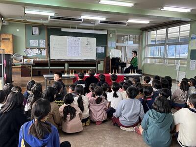 12月20日(水)の昼休み時間に本校音楽室でクリスマスコンサートが開かれました。この時間を楽しみにしていた100名以上の子ども達が、音楽室に集まりました。まず初めに、クリスマスソング2曲を集まった子ども達や職員全員で歌いました。中には、鈴を持ち、踊りながら歌う子ども達もいました。その後、本校職員4名から子ども達へのプレゼント。「星に願いを」のハンドベル演奏。1回しか練習していないとは思えない素敵な演奏を披露してくれました。都農南小学校のこの温かい雰囲気に感動した素敵な時間でした。2学期も残すところあと2日。一足早いのクリスマスプレゼントをもらった子ども達は、残りの2日間も明るく元気に過ごしてくれることでしょう。