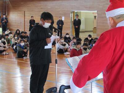 12月22日(金)に、本校児童の登下校を見守る「南風パトロール隊」の方々との交流会を行いました。今回は、6名の方々にお越しいただきました。隊員の方々の紹介をしていただいた後、あいさつや交通安全についてお話をしていただきました。その後、隊員の方々からクリスマスプレゼント。隊員の方々のハーモニカ演奏に合わせて、「ふるさと」と「お正月」を全校で歌いました。とても寒い日でしたが、この歌声でとても温かい空間へと変わりました。その後、代表の6年生が感謝の気持ちを伝えました。最後に、全校で今年1年の感謝と来年への温かい見守りをお願いして、交流会が終わりました。
