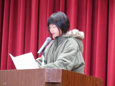 まず、2年生児童が代表で作文発表を行いました。代表児童は、「かけ算九九ができるようになったこと」「鉄棒の練習を頑張ったこと」「給食を残さず食べることができるようになったこと」について発表しました。その中で、努力することでできるようになったうれしさを述べていました。