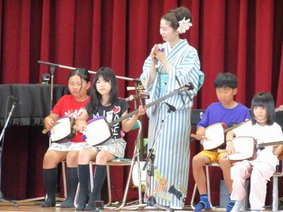 6月12日(水)の3・4校時に、都農南小・東小合同の鑑賞教室を南小の体育館で行いました。今回の鑑賞教室は、村上三弦道によります三味線を中心とした音楽鑑賞教室でした。目の前で繰り広げられた生の三味線の演奏の迫力に子ども達は釘付けでした。途中の場面では、代表児童が阿波踊りのリズムに乗って踊ったり、実際に三味線の演奏をしたりなどの場面があり、会場が一層盛り上がりました。子ども達にとって、とても有意義な時間となりました。今後も、このような機会を設け、都農南小学校の子ども達の情操教育を推進することができましたら幸いです。