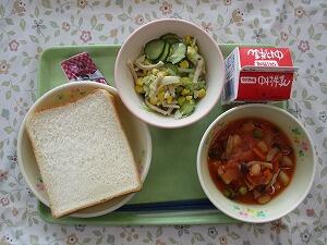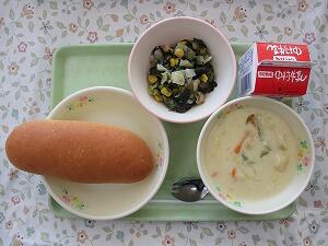 チーズパン 牛乳 野菜のスープ煮 海藻サラダ 562Kcal