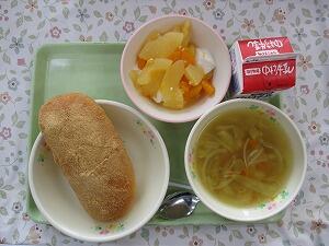 揚げパン 牛乳 キャベツと豆のカレースープ フルーツ杏仁 653Kcal