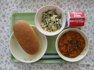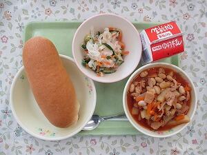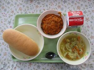 コッペパン 牛乳 キャベツと豆のカレースープ かぼちゃのミートソース煮 564Kcal