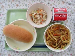 減量ミルクパン 牛乳 カレーうどん 野菜のささみ和え 577Kcal