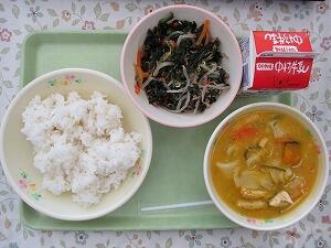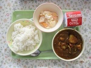 今日の給食のカレーには、さつま芋としめじの秋の味が入っていました。食べ物にはそれぞれ「旬」といわれる栄養価が高くなり、ふだんよりおいしく食べられる時期があります。スーパーなどに行ってみると旬の食材はたくさん売り場に並べられているので機会があれば見てみてください。