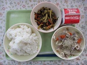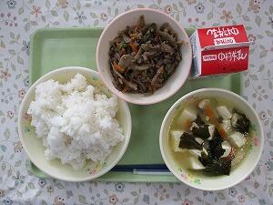 ごはん 牛乳 鶏とわかめのスープ 蓮根とごぼうの金平 574Kcal