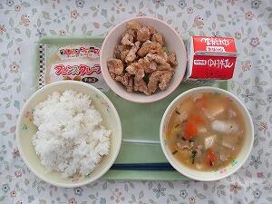 ごはん 牛乳 コーンスープ 唐揚げ 茹でキャベツ 670Kcal