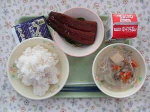 今日の給食に出ている「鰻の蒲焼」は宮崎市にある業者の「鰻楽」さんから提供していただいたものだそうです。別でついているたれをごはんにかけていただきました。