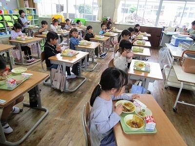 4月15日(月)は、入学した1年生の初めての給食でした。メニューは、ご飯、牛乳、ポークカレー、キャベツのサラダ、お祝いデザートでした。1年生の子ども達は、目の前に運ばれてきた初めての学校給食に目をキラキラさせながら食べる時間を待ちました。そして、「いただきます。」の号令とともに、「おいしいね。」と言いながら次々に給食を口に入れていました。中には、おかわりをする子どももいました。デザートまで食べると大満足の様子でした。この給食の時間が、子ども達にとって毎日楽しい時間になりますように!