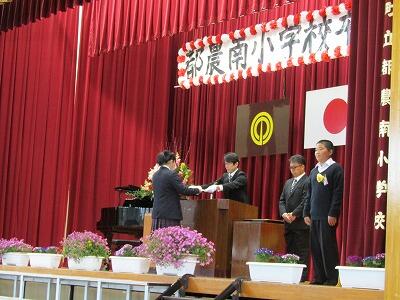 次に、修了証が渡されました。各学年の代表が登壇し、校長が修了証を読み上げ、代表児童に手渡しました。代表児童以外は、代表児童と一緒に礼をして、修了が認められたことを実感していました。