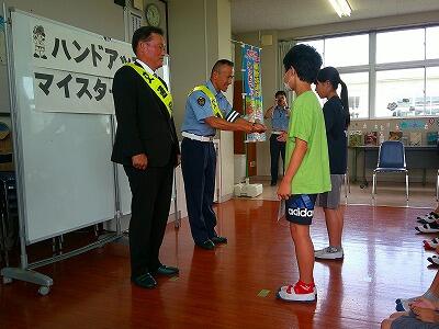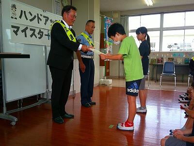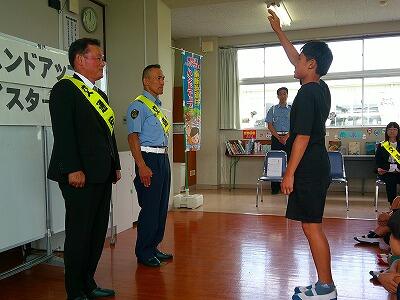 式の中では、6年代表児童により「私たち都農南小学校6年生は、東児湯ハンドアップマイスターとして、登下校や休みの日も、手上げ横断を積極的に行い、下級生のお手本となれるように頑張ります。」と宣誓されました。