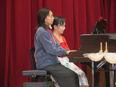 コンサートは、クリスマスの歌を全員で歌うところから始まりました。子どもたちも職員も楽しそうに体を動かしながら歌っていました。その後、職員によるピアノの連弾やハンドベル演奏が行われ、会場が盛り上がりました。また、ギターや金管楽器の演奏に合わせ、職員による歌やフラダンスが披露され、会場が更に盛り上がりました。