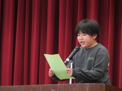まず初めに、4年生の代表児童が作文発表を行いました。「2学期の反省と今年のめあて」という題名での発表でした。「ピアノの発表会でひく曲の練習をこれまでたくさん頑張った。発表会に向けて更に練習を続けたい。」「これまで5年生に向けて漢字の練習をしてきた。小テストや漢字50問テストで100点をとりたい。」「運動会で棒踊りをがんばった。5年生では、大きな声を出し、絶対に勝ちたい。」という思いを堂々と伝えることができました。