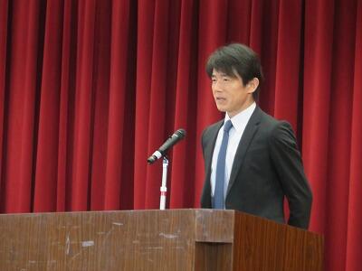 その後、校長が話を行いました。「大きな事故やけががなく終業式の日を迎えられてうれしい。2学期は、大きな行事の中で、普段の学びの力を発揮してくれた。学習面で、自分の考えをもとに発表する姿が見られた。」など、子どもたちの成長を賞賛しました。更に「冬休みは、規則正しい生活をしてほしい」「自分の命は自分で守ってほしい」「これまでの南小のすばらしいあいさつを地域でも行ってほしい」等と付け加えました。