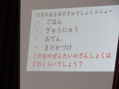 3学期の終業式のあとに、1月の生活目標についての話を行いました。1月の目標は、「残さず食べて、命を大切にしよう」です。これまでの、南小の給食の残食の様子をプレゼンテーションを用いて振り返りました。南小は都農町内の学校の中でも、残食が少ないことが分かりました。明日からまた給食が始まります。感謝の気持ちをもちながら、おいしくたくさん食べてくれることを願っております。