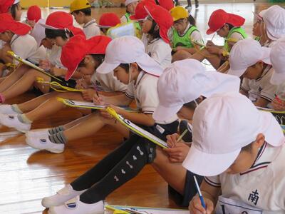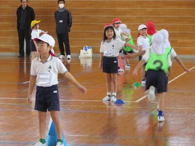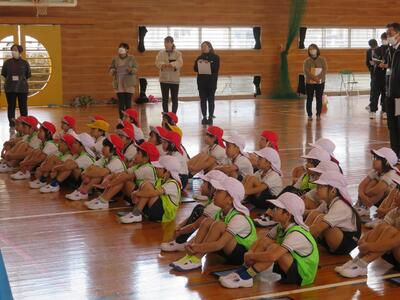 1月15日(水)に、1年生が体育の授業公開を行いました。「都農町の幼保小の連携・接続の重要性の認識を深め、今後の円滑な接続や連携推進の意欲喚起を図る」ことを目的にした「都農町幼保小連携接続会議」の一環で行われました。中西教育長をはじめ、町内の小学校や幼稚園・保育園の先生方が25名程度参加しての実施でした。
