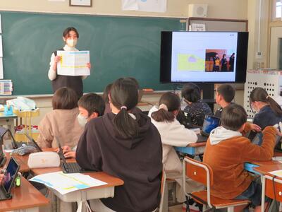 都農町では、外国語(英語)において、小中学校間での相互乗り入れ授業を行っています。