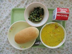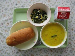 コッペパン 牛乳 パンプキンポタージュ ほうれん草のアーモンド和え 581Kcal