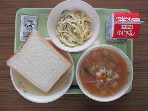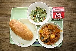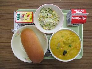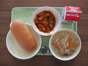 ミルクパン 牛乳 千切り野菜のスープ かぼちゃのミートソース煮 597Kcal
