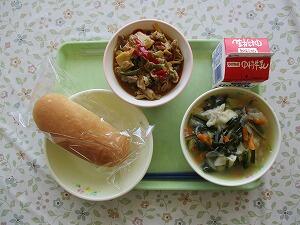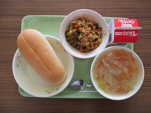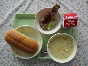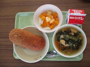 今日のパンは、背割りパンでした。ドライカレーをはさんでいただきました。また、スープには冬野菜の1つ白菜を使っています。白菜には、血圧を下げ、高血圧予防に効果があるカリウムが多く含まれているそうです。