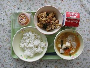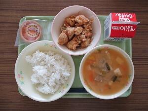 ごはん 牛乳 唐揚げ キムチ汁 茹でもやし 焼きプリンタルト 725Kcal