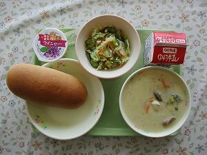 今日の給食は、都農小学校のリクエスト給食でした。肌寒くなってきた季節に食べたくなる、クリームシチューと成長に必要なカルシウムがしっかりとれるチーズサラダ、デザートにワインゼリーの組み合わせです。