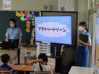 今回は宮崎県警察本部少年サポートセンターから講師を迎えての実施でした。「心と体を守るくもくん教室」と題して授業がなされていきました。主に水着で隠れる部分をプライベートゾーンということや無理矢理触られたり、見せられたりするときは、「いや」と大きな声を出してきっぱりと断り、その後、安心できる大人に知らせることなどを学びました。1年生の子ども達は、45分間の学習に集中して取り組み、真剣に受け答えをしていました。ニュース等で性犯罪の報道がなされている昨今。今回の学習を通して、自分自身のこと、そして、周りの友達のことまでしっかり守れる子ども達に育って欲しいと思っております。