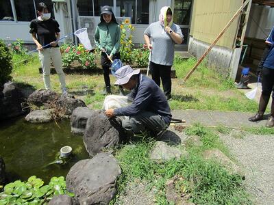 中庭にある池の生物調査を行いました