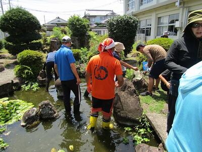 7月28日(金)に、本校の中庭にある池に生息する生物調査を行いました。