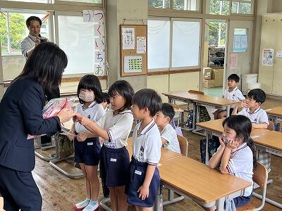 今回贈呈されたおまもりは、都農町の姉妹都市として交流をしている沖縄県糸満市商工会女性部の方々からいただいたものです。一つ一つ手作りされたもので、作成後、交通安全祈願をし、糸満市内の小学校と本校に寄贈していただきました。4月11日に入学した1年生へ中西教育長から代表児童に手渡されました。このおまもりをランドセルにつけ、元気に笑顔で登下校して欲しいと思っております。