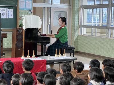 12月20日(水)の昼休み時間に本校音楽室でクリスマスコンサートが開かれました。この時間を楽しみにしていた100名以上の子ども達が、音楽室に集まりました。まず初めに、クリスマスソング2曲を集まった子ども達や職員全員で歌いました。中には、鈴を持ち、踊りながら歌う子ども達もいました。その後、本校職員4名から子ども達へのプレゼント。「星に願いを」のハンドベル演奏。1回しか練習していないとは思えない素敵な演奏を披露してくれました。都農南小学校のこの温かい雰囲気に感動した素敵な時間でした。2学期も残すところあと2日。一足早いのクリスマスプレゼントをもらった子ども達は、残りの2日間も明るく元気に過ごしてくれることでしょう。