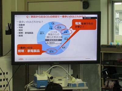 その後、家庭で温室効果ガスの排出量が多いものが、照明など電気を使うものであることや室内と外側の熱交換が一番行われているのが「窓」であること、太陽から発せられる日光が当たっている空気の部分に熱が発生することなどを学びました。
