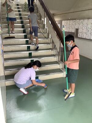 たすきをかけた「あいさつ運動」、みんなが使う階段や廊下の「清掃活動」。