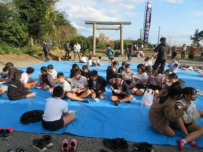 12月13日(金)に5年生が、篠別府地区の冬祭りで棒踊りを奉納しました。5年生は、これまで運動会での棒踊りを披露することを目指して篠別府地区棒踊り保存会の方のご指導の下、練習を重ねてきました。一昨年度は冬祭りで踊られなかった棒踊りを、昨年度から都農南小学校の5年生が踊らせていただけるようになり、篠別府地区の冬祭りの一助を担うことができたことは南小の喜びでもあります。棒踊り披露後は、地域の方の温かなぜんざい等のおもてなしを受けました。子どもたちは、何杯もおかわりをし、温かで幸せな時間を過ごしていました。宮司さんからお土産のお菓子までいただき、帰路につきました。たくさんのおもてなしに感謝申し上げます。