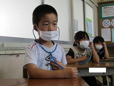 その後、子どもたちは自分自身の命について学習しました。まず、聴診器で自分の心音を聞く活動を行いました。椅子に座っている状態の心音と運動後の心音を聞き比べることで、自分の命と向き合いました。