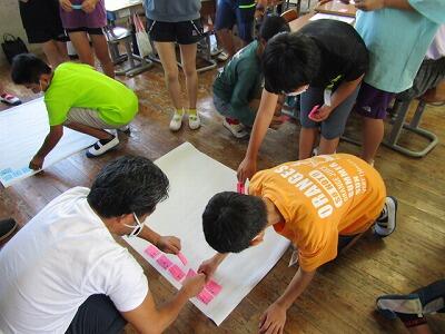 6月28日の全校朝会で、5・6年生の有志30名ほどが、自分たちで作った劇の中で「マスクを付ける場面」「マスクを外す場面」について分かりやすく説明をしてくれました。